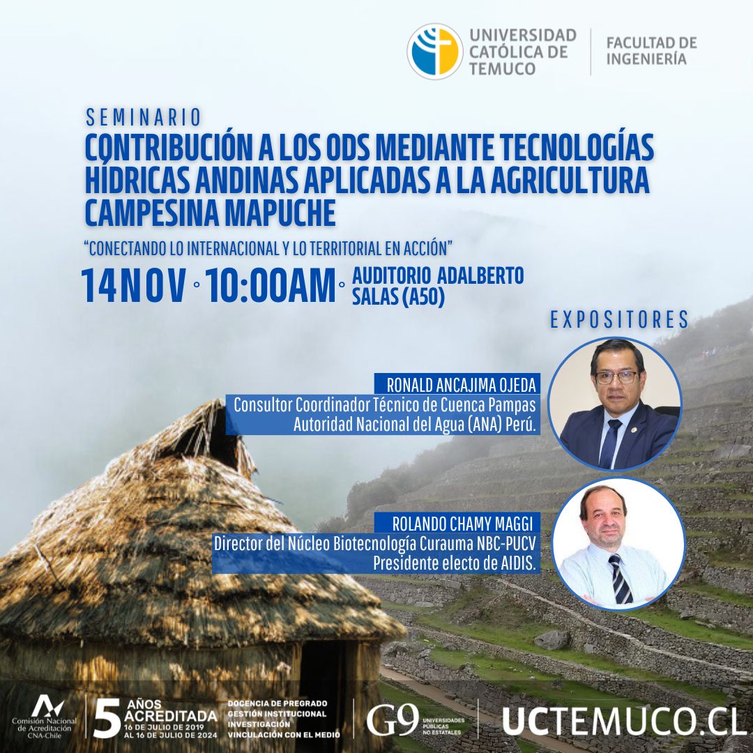 El seminario, que incluye al Ingeniero Ronald Ancajima Ojeda, Consultor Coordinador Técnico de Cuenca Pampas, Autoridad Nacional del Agua (ANA) Perú, como expositor principal, tiene como objetivo realizar una presentación sobre tecnologías andinas de origen incásico que han sido la base de la agricultura familiar campesina en Perú cuya transferencia hacia la zona sur de Chile y el pueblo mapuche se estima que puede favorecer medidas para combatir el cambio climático con pertinencia cultural.